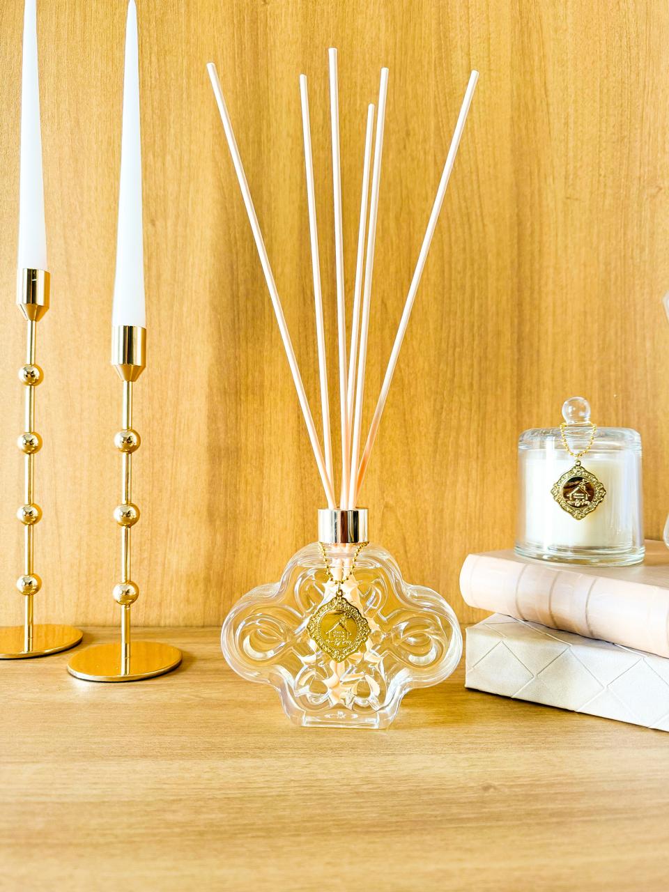 Seu frasco de vidro com design sofisticado e detalhes dourados adiciona um toque de luxo à decoração — perfeito para salas, quartos ou lavabos.