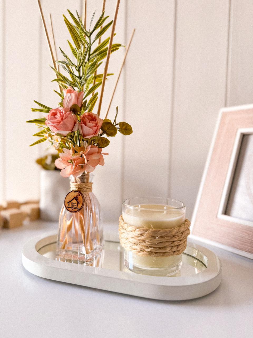 Com um arranjo delicado em tons rosados e folhagens naturais, o difusor leva sofisticação e aconchego ao ambiente.