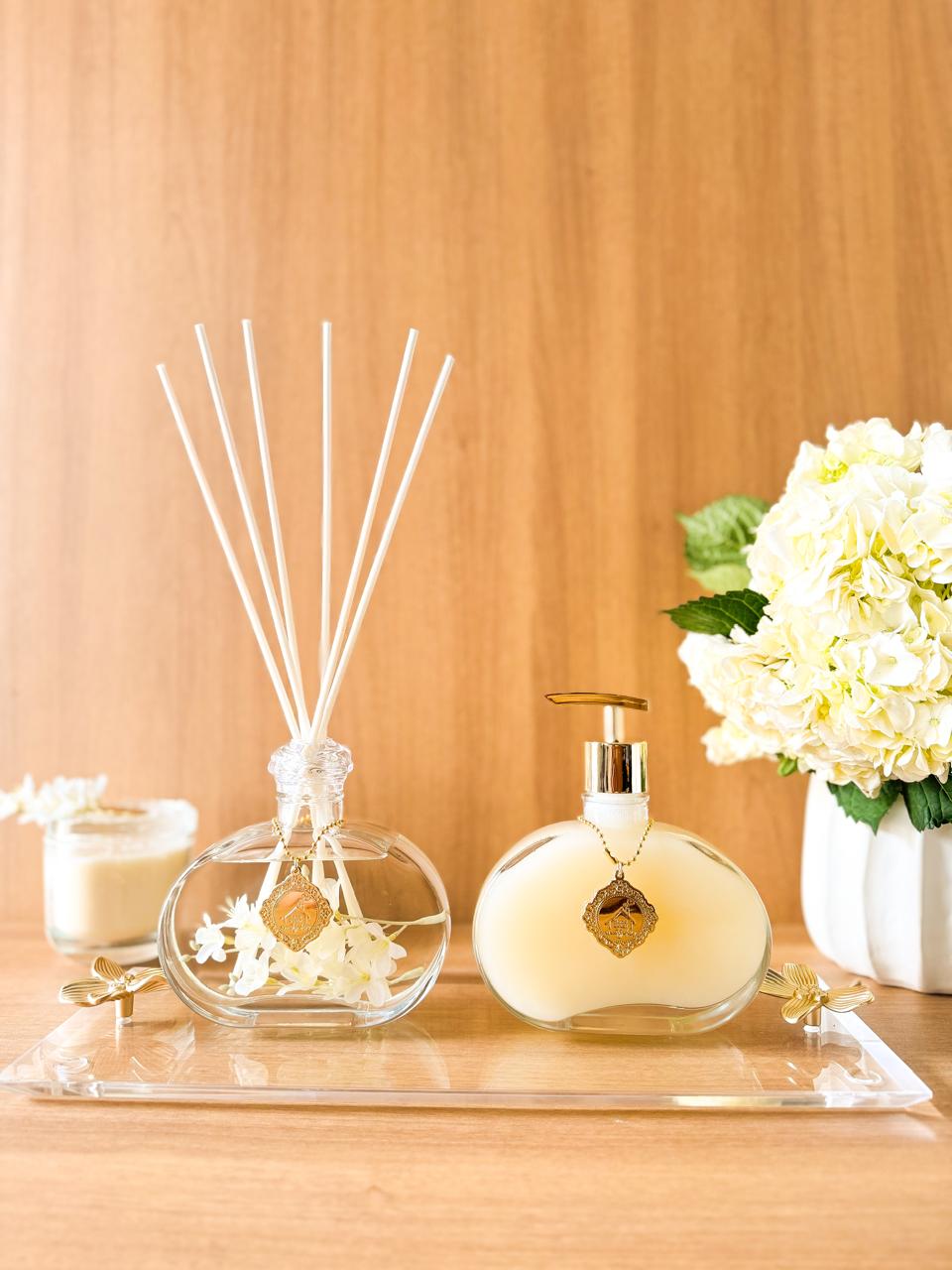 Transforme o seu lavabo com a elegância do Kit Lavabo Verbena Home. Este conjunto exclusivo não apenas perfuma delicadamente o ambiente,adicionando um toque de sofisticação à sua decoração. Inclui bandeja de vidro com um design retângular, perfeito decorar bancadas com espaço reduzido e deixar seu lavabo totalmente perfumado e com estilo.